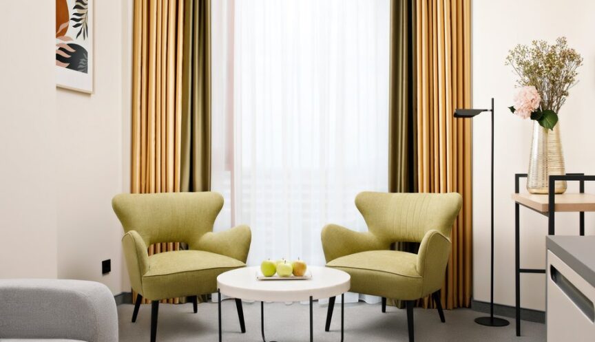 Двухкомнатный номер типа «Делюкс» оборудован мебелью, включая вешалку, диван, зеркало, двуспальную кровать с прикроватными тумбочками, стол, стул и шкаф. В номере есть кондиционер, сейф и телевизор. Санузел с душем и феном. Имеется дополнительное место — диван. Количество основных и дополнительных мест — по два.