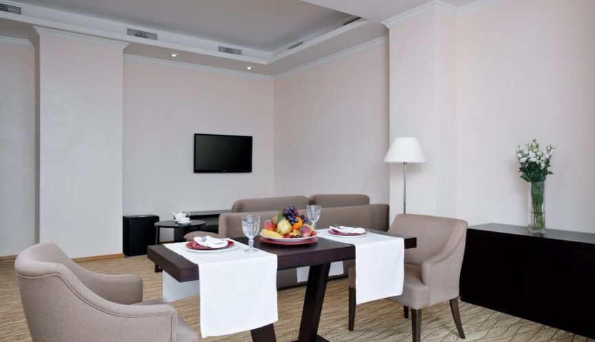 Двухкомнатный люкс площадью 70 квадратных метров предлагает комфортное размещение для двоих человек с возможностью размещения ещё двоих на раскладном диване. В номере есть два санузла с ванной и душевой кабиной, биде, а также все необходимые туалетные принадлежности, включая тапочки и фен.