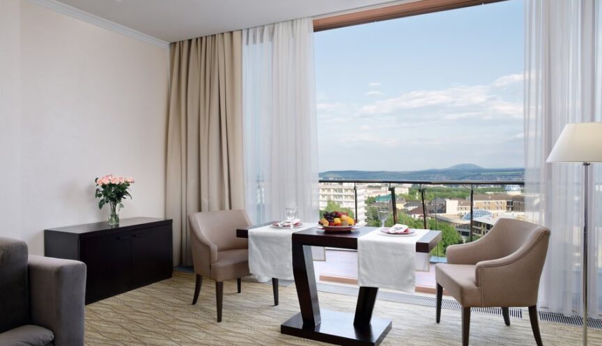 В номере предусмотрены вешалка, зеркало, двуспальная кровать с прикроватными тумбочками, стол, стулья и шкаф-купе для хранения вещей. Кроме того, в номере есть сейф, сплит-система, ЖК-телевизор, телефон и чайный набор посуды. На балконе установлена мебель.