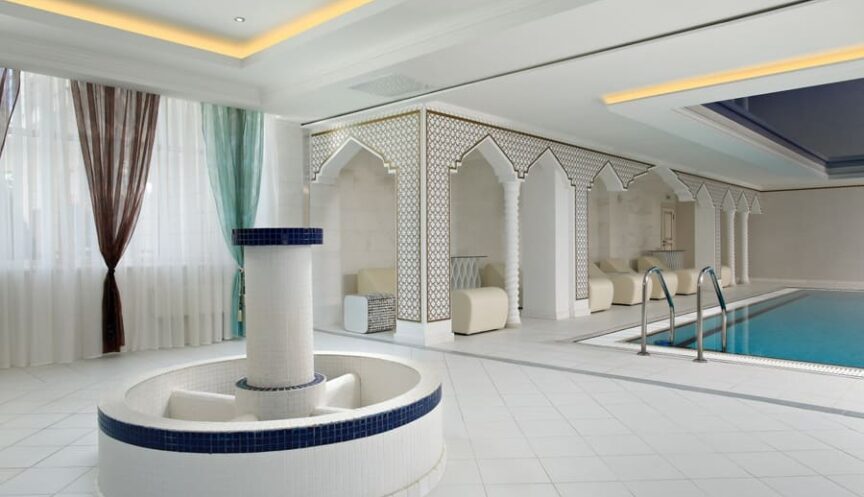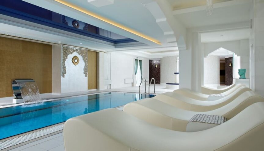 В зоне релаксации находится бассейн с гидромассажем и цветотерапией, который имеет размеры 10 метров в длину, 2,7 метра в ширину и глубину 2 метра.