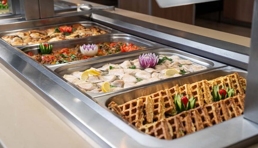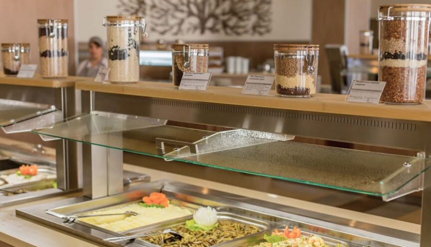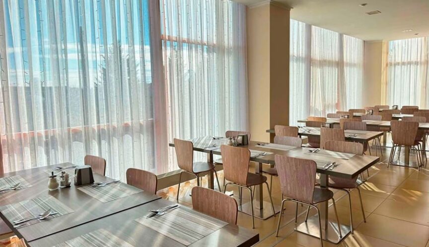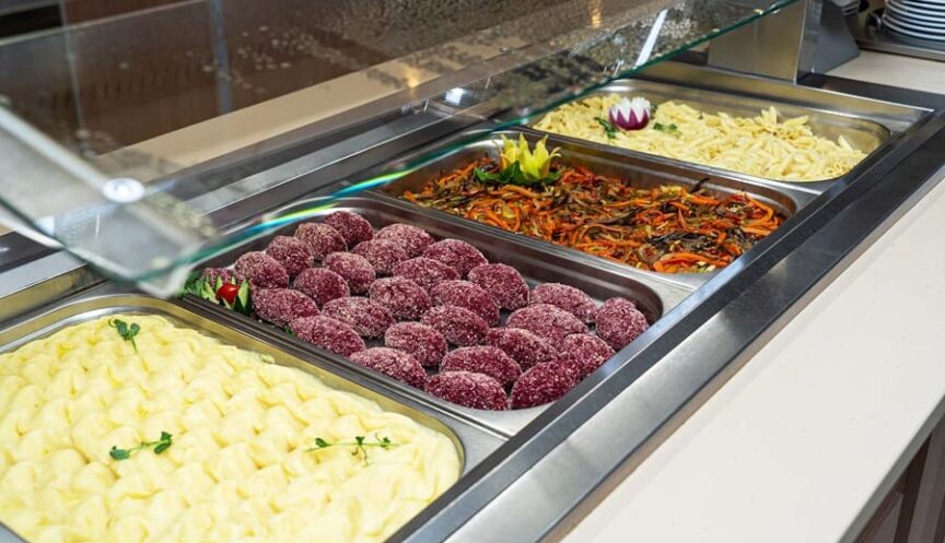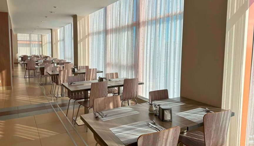 Просторный, светлый зал питания «Скандинавия» расположен на 3-м этаже корпуса «Бештау», между жилыми корпусами «Машук» и «Эльбрус». Уютный зал предлагает широкий ассортимент блюд по системе шведский стол, включая диетические блюда европейской, кавказской и русской кухонь.