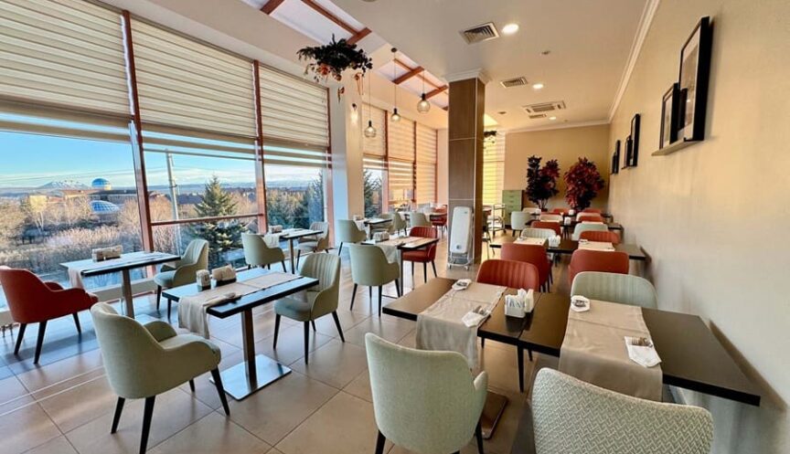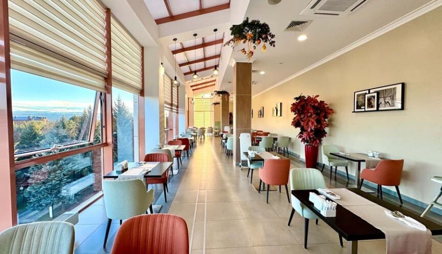 Панорамный VIP‑зал питания «Сан‑Сити» расположен на 4‑м этаже корпуса «Бештау», между жилыми корпусами «Машук» и «Эльбрус». Светлое и уютное пространство с завораживающим видом на Кавказский хребет, горы‑лакколиты и высочайшую вершину Европы — Эльбрус. Зал на 60 мест предназначен для питания гостей категорий «Студия», «Джуниор сьют», «Сьют», «Люкс», «Люкс Восточный» и «Президентские апартаменты».